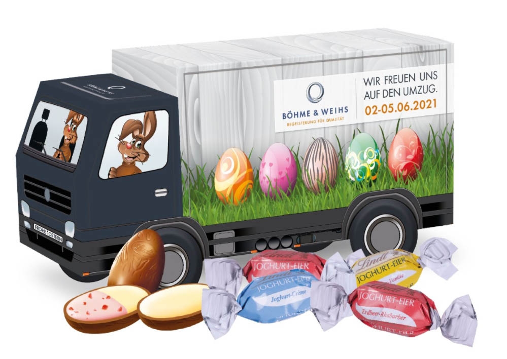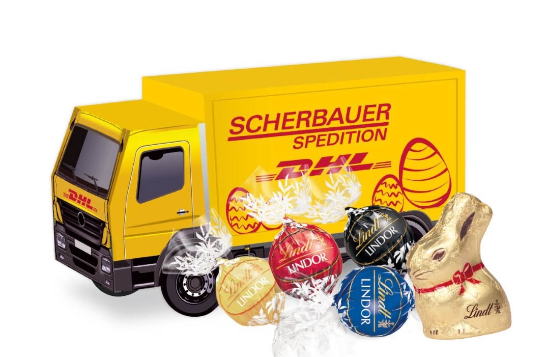 Lindt Schokolade Schoko-Eier und Hase Oster Präsent Form LKW, Ihr Osterexpress mit viel Platz zum Werben.