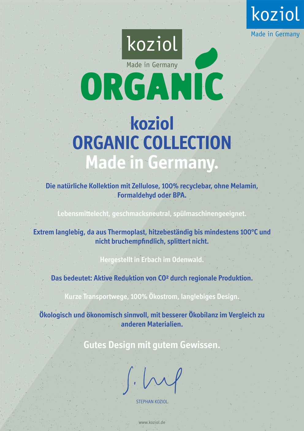 Die natürliche Kollektion von koziol ist mit Zellulose, 100% recyclebar, ohne Melamin, Formaldehyd oder BPA.