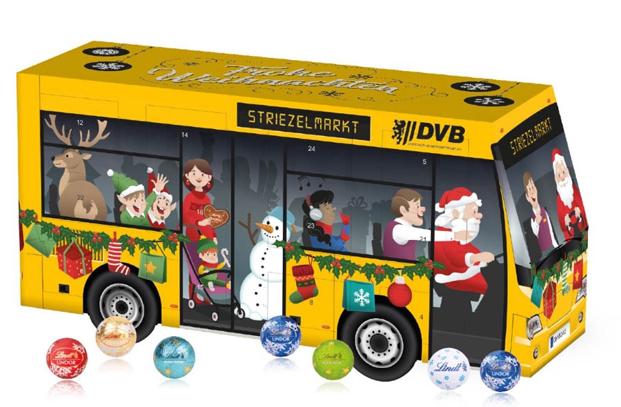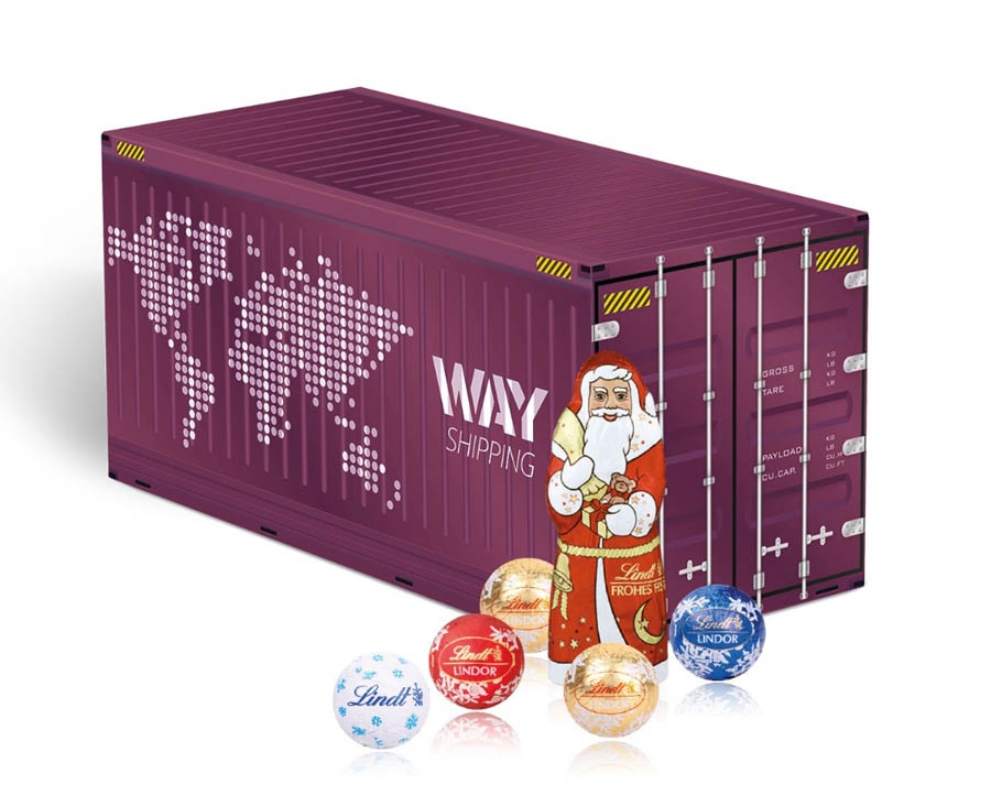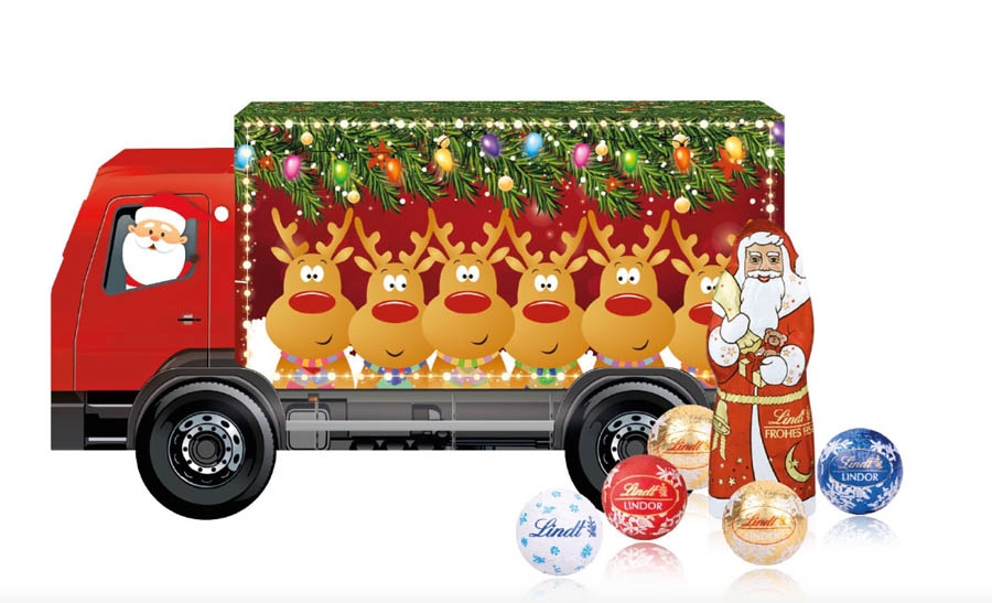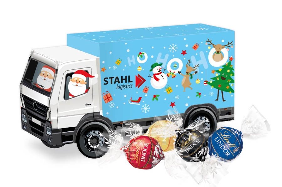 Diesen Werbeartikel – Weihnachts LKW, Transporter, Camper und Container, Schulbus mit Lindt befüllt – können Sie individuell mit Ihrer Werbung veredeln.